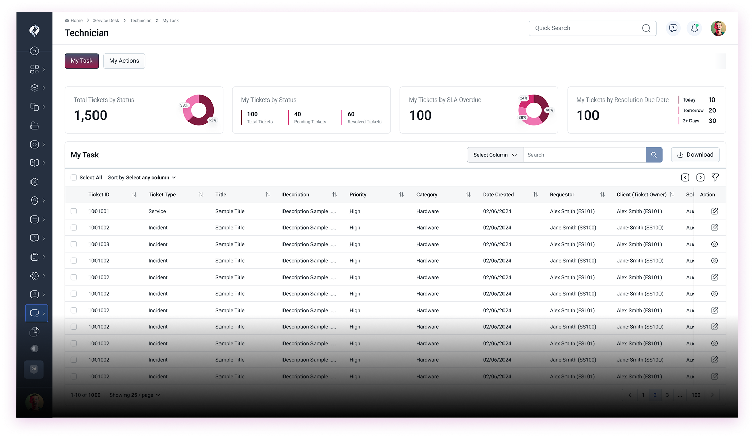 For IT teams, Hexalytics ITSM provides a powerful technician dashboard that organizes tickets by category, team, and priority. Technicians can view all assigned tasks, track pending and resolved issues, and manage workloads efficiently with built-in metrics and performance summaries.